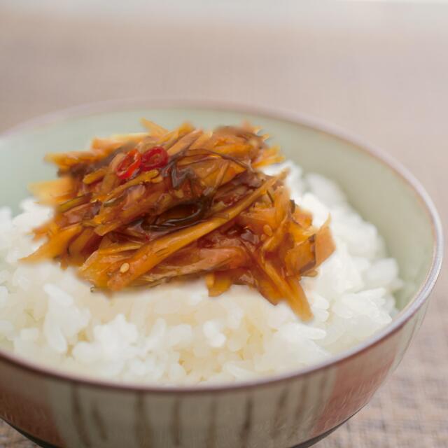- ささがきごぼうに昆布の旨み、ごまの風味、唐辛子の辛みを加え、しょうゆベースの甘辛味にしました。